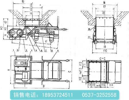 1、减速机 2、电动机 3、传动平台 4、联轴器 5、H形架 6、连杆 7、给煤槽 8、闸门 9、机架 10、漏斗 11、托辊