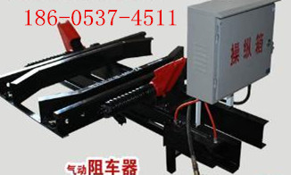 2、气动抱轨式阻车器:主要由电控箱或气控箱(含空气过滤装置)、双阻车器主体、位置传感器(或遥控器)等组成。该装置以固定风源为动力,气缸为动力执行部件,通过气缸的伸缩来实现挡爪的开与关。