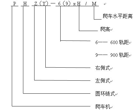 液压链式爬车机用于600轨距1t、1.5t及900轨距1.5t、3t矿车向上爬高,根据爬高不同共有14种型号,每种又根据传动装置布置方式不同分为左侧式与右侧式。