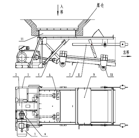 图1 GMW系列往复式给料机结构示意图 1.隔爆电动机 2.减速机 3.传动机架 4.联轴器 5.H形架 6.曲柄连杆装置 7.给料底板 8.闸门 9.机架体 10.滚轮体 11.漏斗